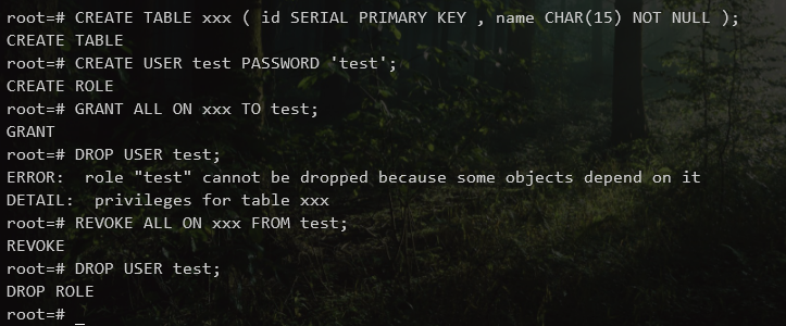 root=# CREATE TABLE xxx ( id SERIAL PRIMARY KEY , name CHAR(15) NOT NULL );