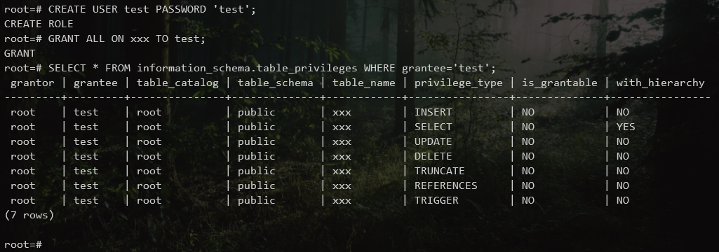 root | test | root | public | xxx | TRUNCATE | NO | NO