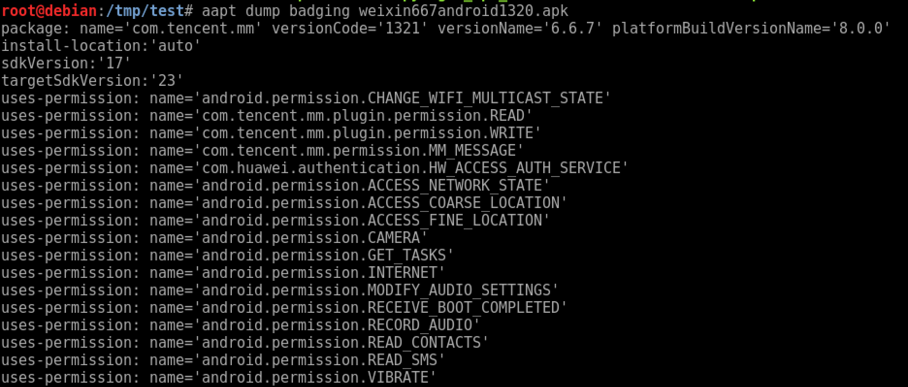 1 | aapt dump badging xxx.apk |